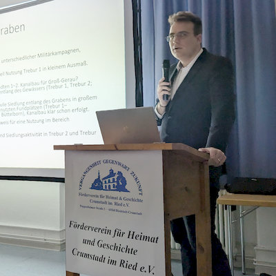 Im Fokus des Abends stand die spannende Frage, ob der Landgraben zwischen Groß-Gerau und Astheim nicht erst, wie lange angenommen, in der Frühen Neuzeit, sondern bereits von den Römern angelegt wurde. Referent war Henrik Leif Schäfer M.A. von der Goethe-Universität Frankfurt, der in seinem gut 45-minütigen Vortrag die Erkenntnisse seiner Doktorarbeit sowie den aktuellen Forschungsstand anhand zahlreicher Funde und Befunde präsentierte.